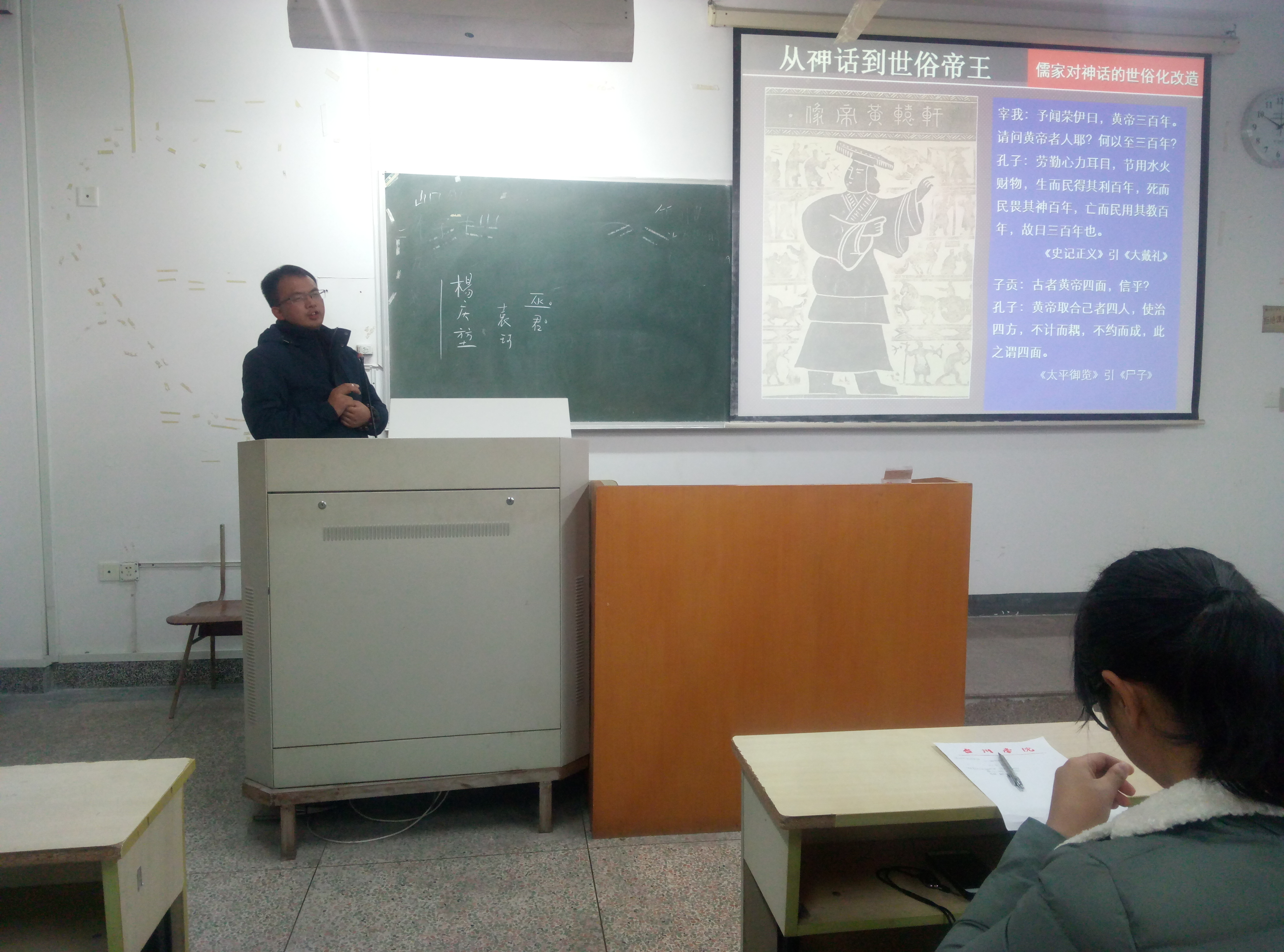 本次讲座在轻松、愉悦的氛围中展开,何善蒙教授首先从自己对妖怪感兴趣这一话题导入,逐步向同学们介绍了以《山海经》为例的中国古代神话。以神话故事的方式引出中国思维方式中的现实性倾向,特别是其中的血源性与伦理性。讲座上同学们全神贯注,一丝不苟地做着笔记,细细体会何善蒙教授的言论。