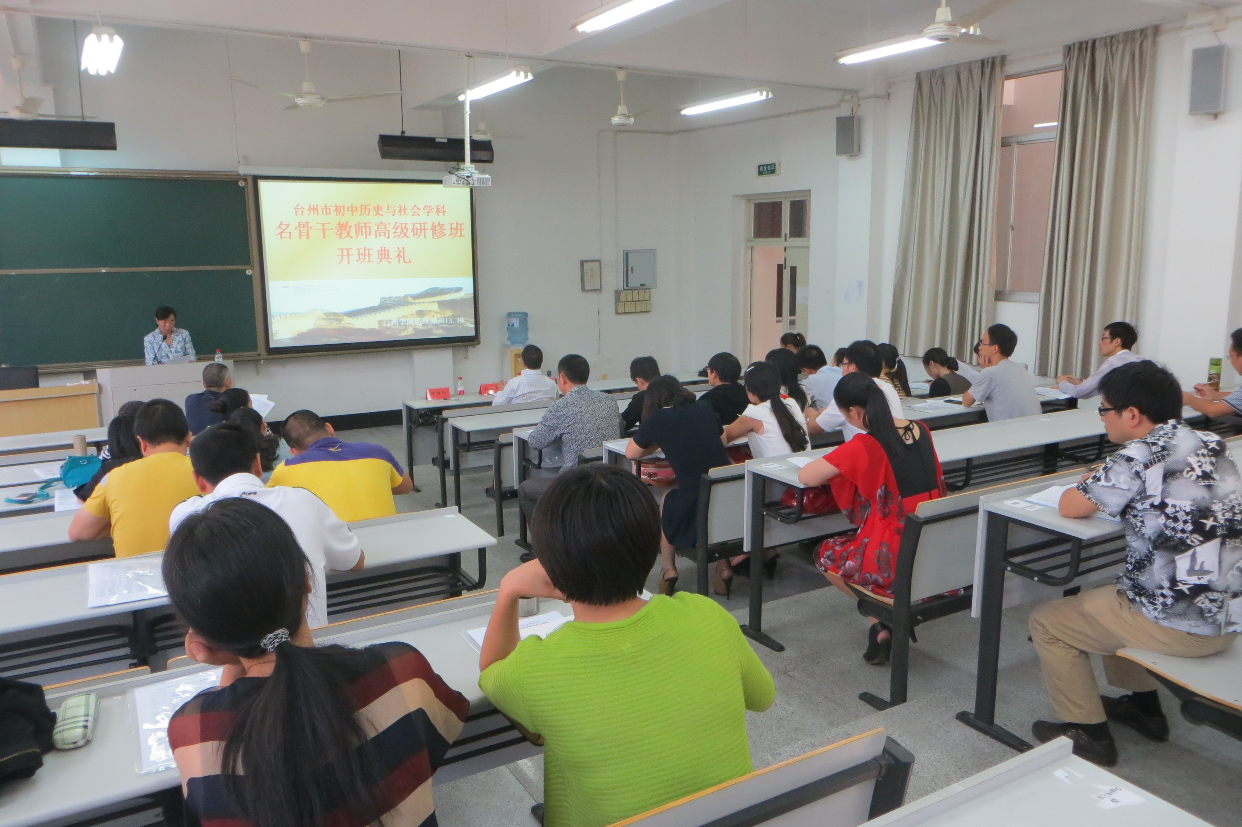 10月14日下午,台州市教育局主办、9428cn太阳集团古天乐思政部承办的台州市初中历史与社会学科名骨干教师高级研修班开班典礼在公司临海校区举行。台州市教育局陆唯珍同志到会讲话,思政部党总支书记杜才平、部副主任林伟出席开班典礼,来自台州9个县市区的35名学员参加开班典礼。