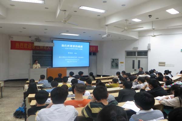 曹荣庆教授从经济学视野,介绍政府和市场的顶层分工,分析个人、市场、政府三者的角色行为关系,比较中西方政府社会职能上的差异性,阐述了市场对资源配置的基础性作用,政府的社会定位和职能体系,社会契约,纳税人监督机制等,紧密联系实际,内容详实,材料生动,观点新颖,同学们很受启发,得益匪浅。两个多小时的讲座,精彩纷呈,赢得了同学们的热烈掌声。
