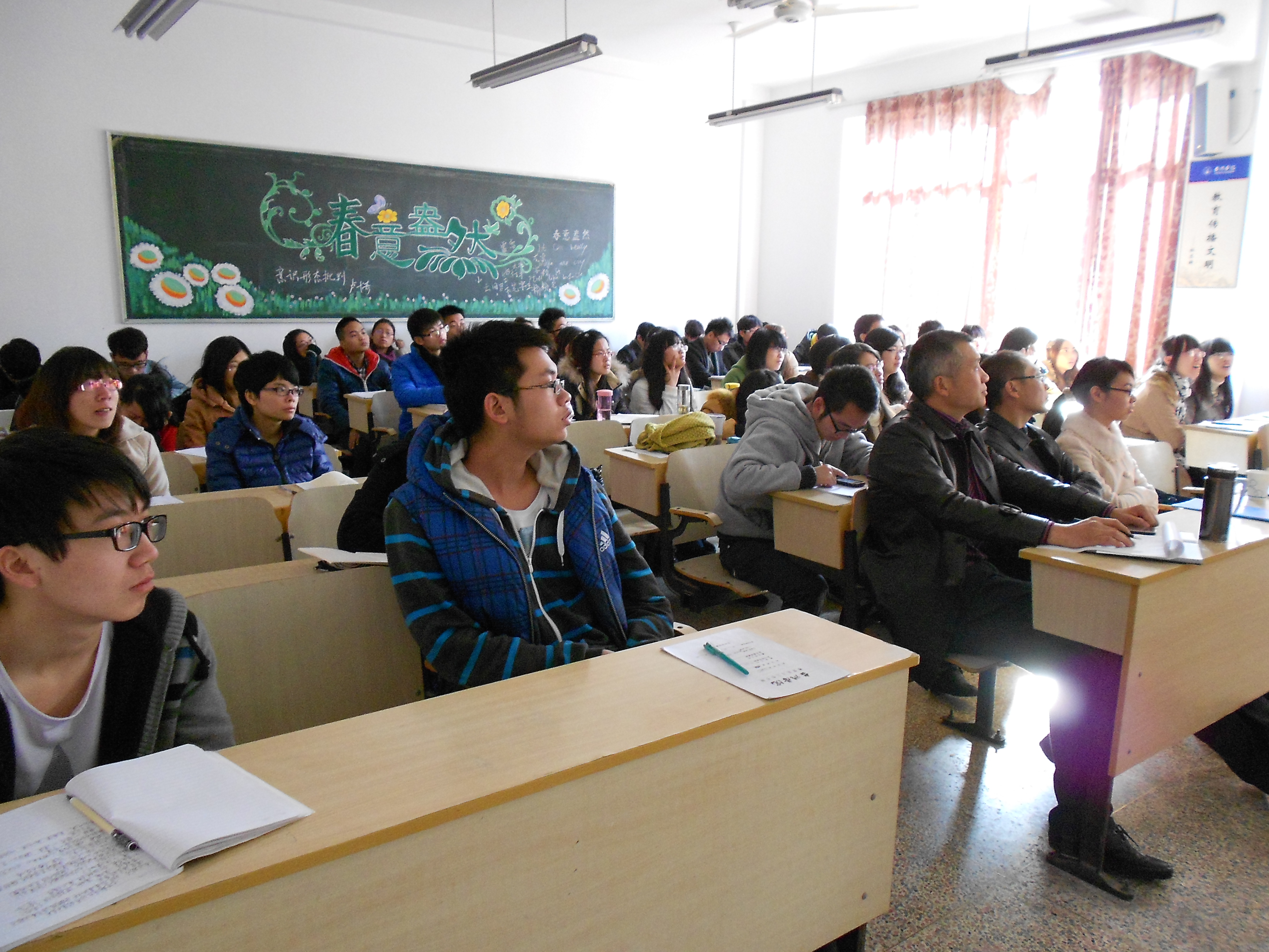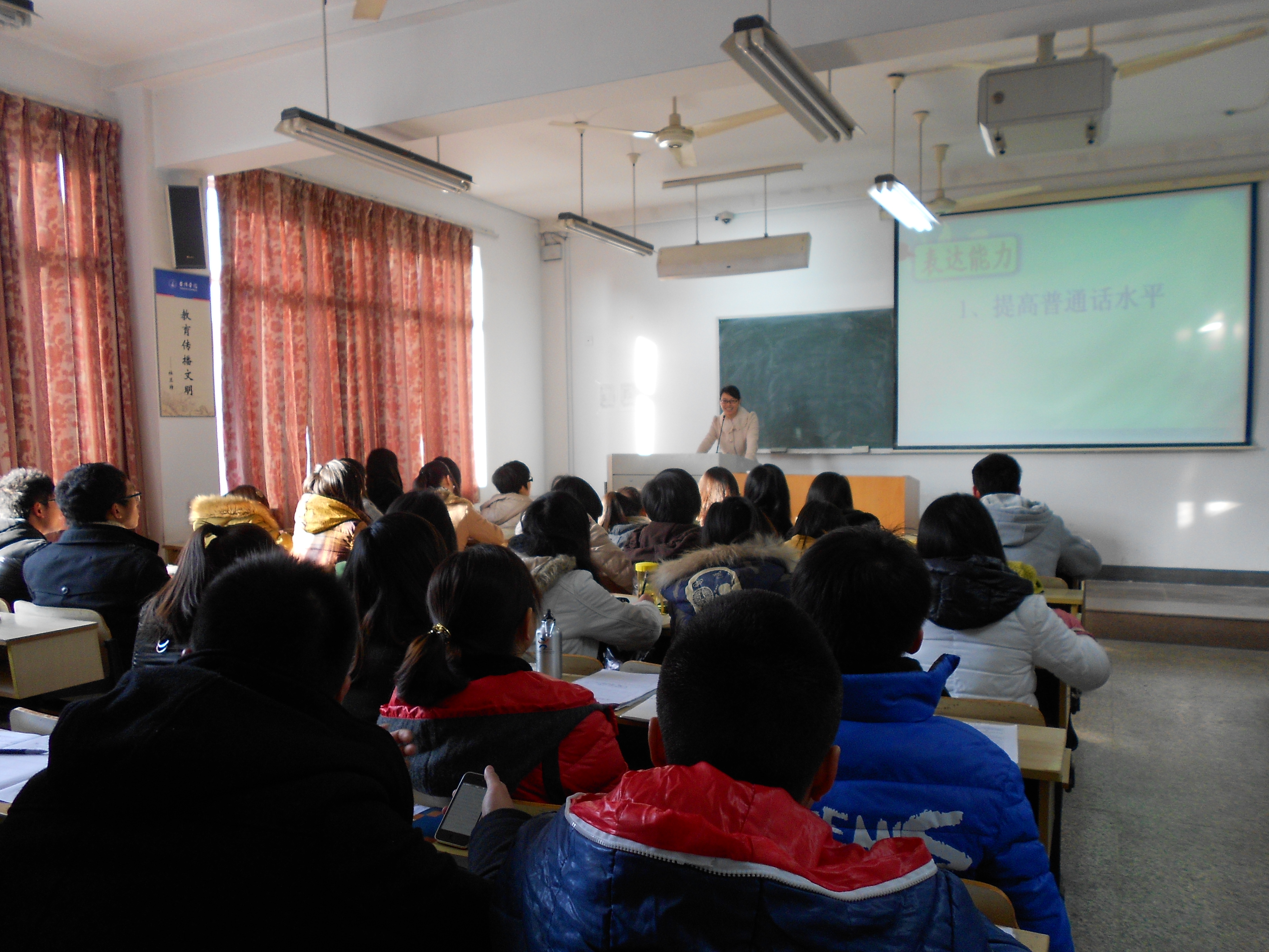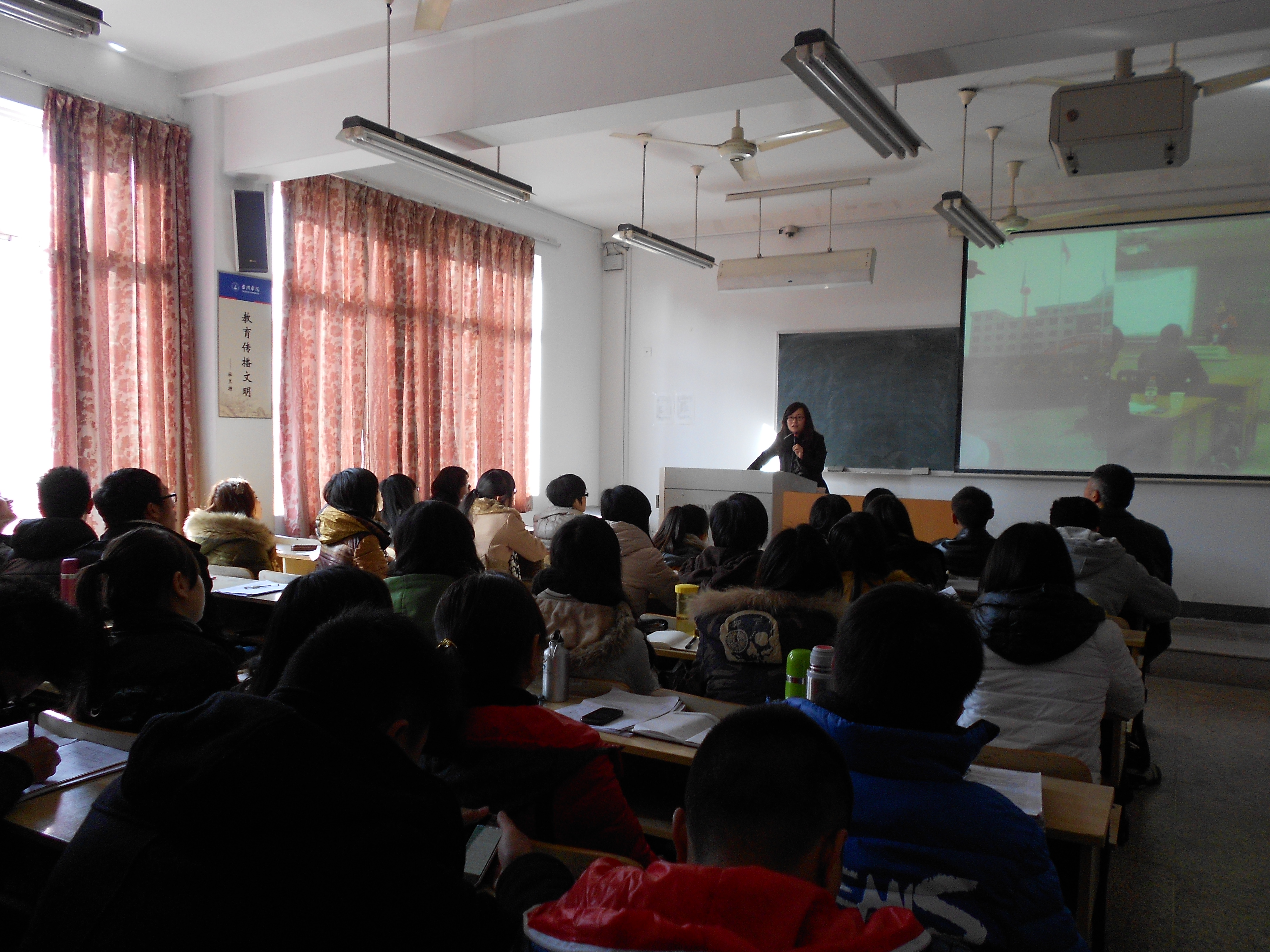 会上,蒋老师首先就自己在台院的从学经历,结合自身在教师职业技能的成长方面,重新审视自己、反思自我,也提请同学们严谨治学、谦虚执教,打好新教师职业成长的每一步——大学期间首要培养的教师基本素养——扎实基本功:把关普通话、狠抓语言表达、立正板书设计;在致于专业学习的同时也要参照相关的教学、管理理论;最后,她还就具体如何去备好一节课作了现场的具体演练。童老师主要与同学们分享了自己参加省现代教育技术应用大赛从中得出的实战经验,在模拟教学与说教的技巧方面作了详细的交流。她讲到,无论是课堂还是比赛锻炼,只要你站在讲台上,那么你就必须自信、必须谦虚。与此同时,两位老师都讲到了教学过程中学会如何制作和正确使用课件的重要性,并就现今多媒体辅助教育存在的问题,提醒同学们在多媒体制作过程中应注意的细节。