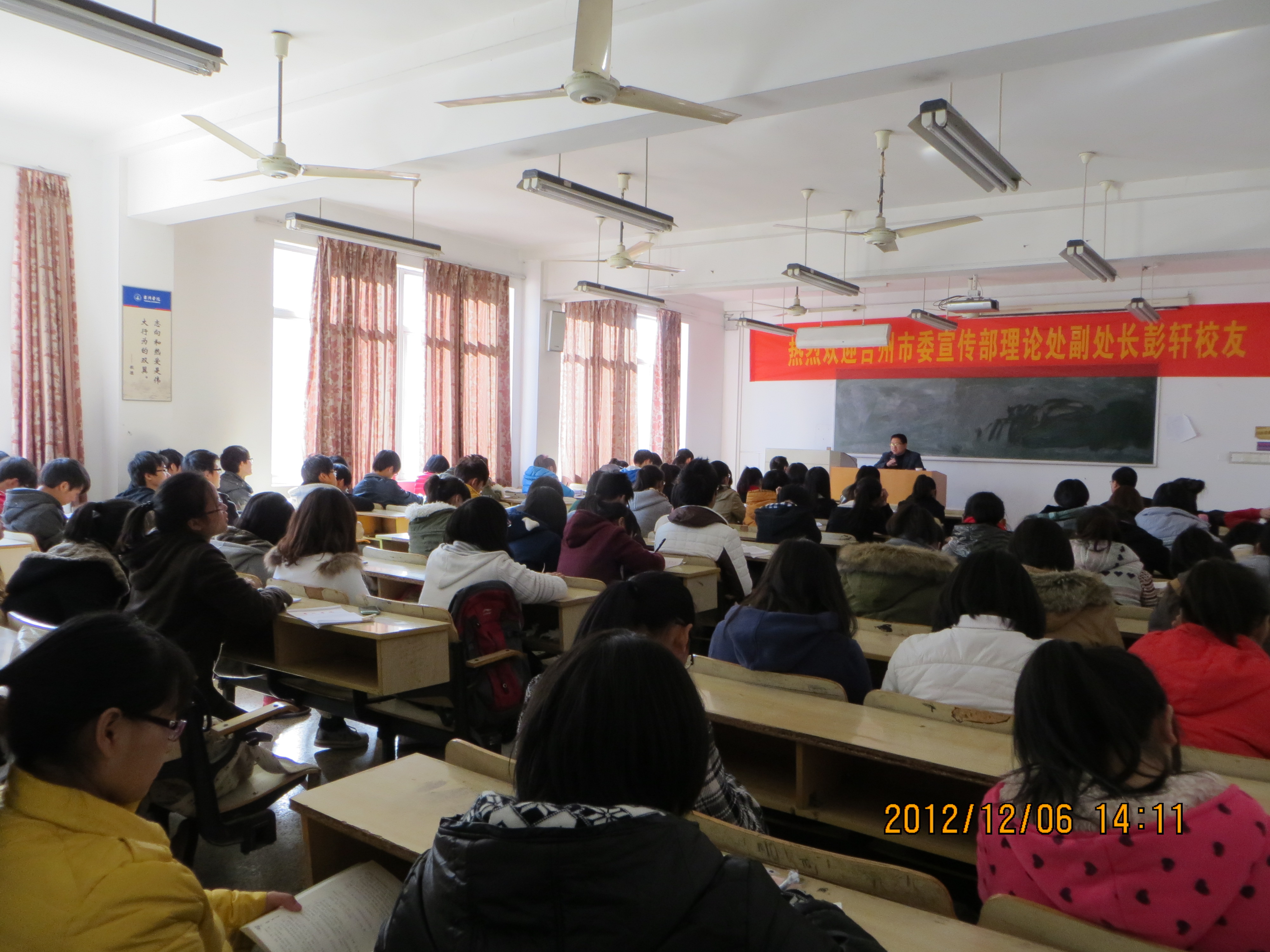 为配合学校升本10周年,12月6日,思政部邀请台州市委宣传部理论处副处长彭轩员工为思想政治教育专业和历史学专业员工作“十八大精神与老员工成长与成才”讲座,部党总支书记杜才平主持讲座。