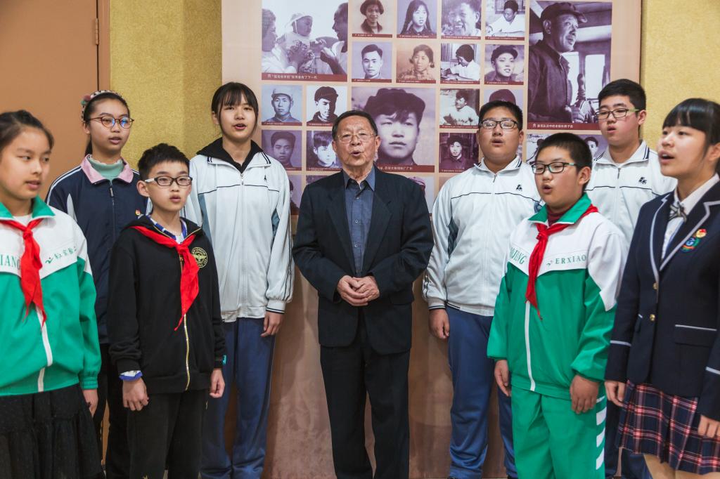 随后,参与2016年写信的员工代表在研究中心展厅的大陈岛垦荒精神浮雕前庄严宣誓,并与老垦荒队员金可人一起高唱《垦荒队员之歌》。金可人老人还与同学们分享了自己在大陈岛的垦荒故事,鼓励同学们继续发扬垦荒精神,不怕苦不怕累,做一个有用的人。