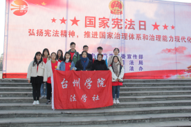 今年12月4日是第六个国家宪法日,也是第二个宪法宣传周。为进一步学习贯彻党的十九大精神,增强全民法治观念,推动全社会树立宪法意识,12月4日上午,台州市、椒江区在市民广场联合举行了“12·4”国家宪法日活动启动仪式,公司法学社参加仪式。同一日法学社还参与了临海市崇和门广场的国家宪法日活动。