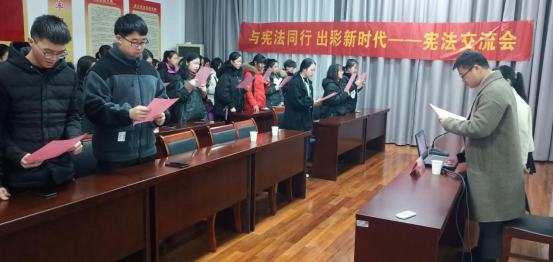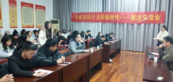 成律师以“法”字开篇,讲解其历史意义。从宪法的地位、宪法的历史以及现行宪法的内容三个方面展开讲解,让同学们清楚自身的权利和义务。现场还设置了提问环节,宪法小知识测试环节,同学们热情参与现场气氛达到高潮。成律师也现场为同学们解答相关问题,从专业的角度为同学们提供相关解答和建议。此外交流会还设置了集体朗读宪法环节,展现了法学社员工的风采。