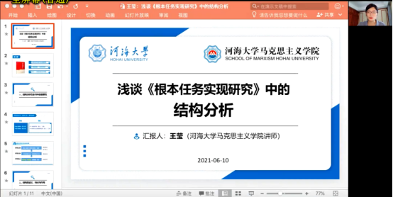 本次读书研讨会采取线上线下相结合方式,学习研讨由孙其昂、王莹和张建晓合著的《高校立德树人根本任务实现研究——社会主义核心价值观教育的社会思维》一书。两位作者现身说法,王莹作“浅谈《根本任务实现研究》中的结构分析”的专题报告,从“结构分析在全书中的重要性”“结构的涵义、特点与作用”“第二、三章的结构分析思路”等三个方面对结构分析做透彻的阐释,并详细介绍了结构分析方法在写作过程中的贯彻运用。张建晓作“简论高校立德树人根本任务实现的科研之维”的专题报告,从“基本定位”“知识面向”“智库诉求”“研究困境”等四个方面对本人执笔的章节进行系统的反思,对高校立德树人这一研究命题的科研基础作了重点阐释,对存在的问题进行深入剖析。与会教师汇报了研读本书的收获、疑问和意见建议。孙教授对大家的发言一一回应,并且指出在科研道路上,我们需要听到不同的声音,而唯有具备较深厚的学术积累,才能在细致阅读的基础上提出真知灼见,思政课教师群体中存在着学术功底欠缺的现象,今后这样的读书研讨会还要多开展,在分享读书收获之时相互学习,在思想的相互碰撞中引发深入的思考,以学术阅读能力的增长推动科研能力的提升。