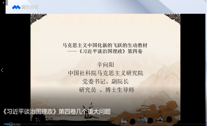 与会人员收看了中国社科院马克思主义研究公司党委书记辛向阳教授关于《习近平谈治国理政》第四卷的学习辅导报告,辛教授的报告解读深入,说理明晰,为把握全书精神脉络,读懂用好最新理论成果提供重要指导;聆听了浙江大学9428cn太阳集团古天乐副经理代玉启教授题为“推动思政课教学研究一体化”的专题报告,报告以思想道德与法治课为例,系统介绍了浙江大学思想政治理论课改革的 “四位一体”的整体性教学改革方案和实践经验,全面分享了教学研究一体化的真知灼见,干货满满,启发性强,为我们深入思政课教学研究提供了方向和思路。