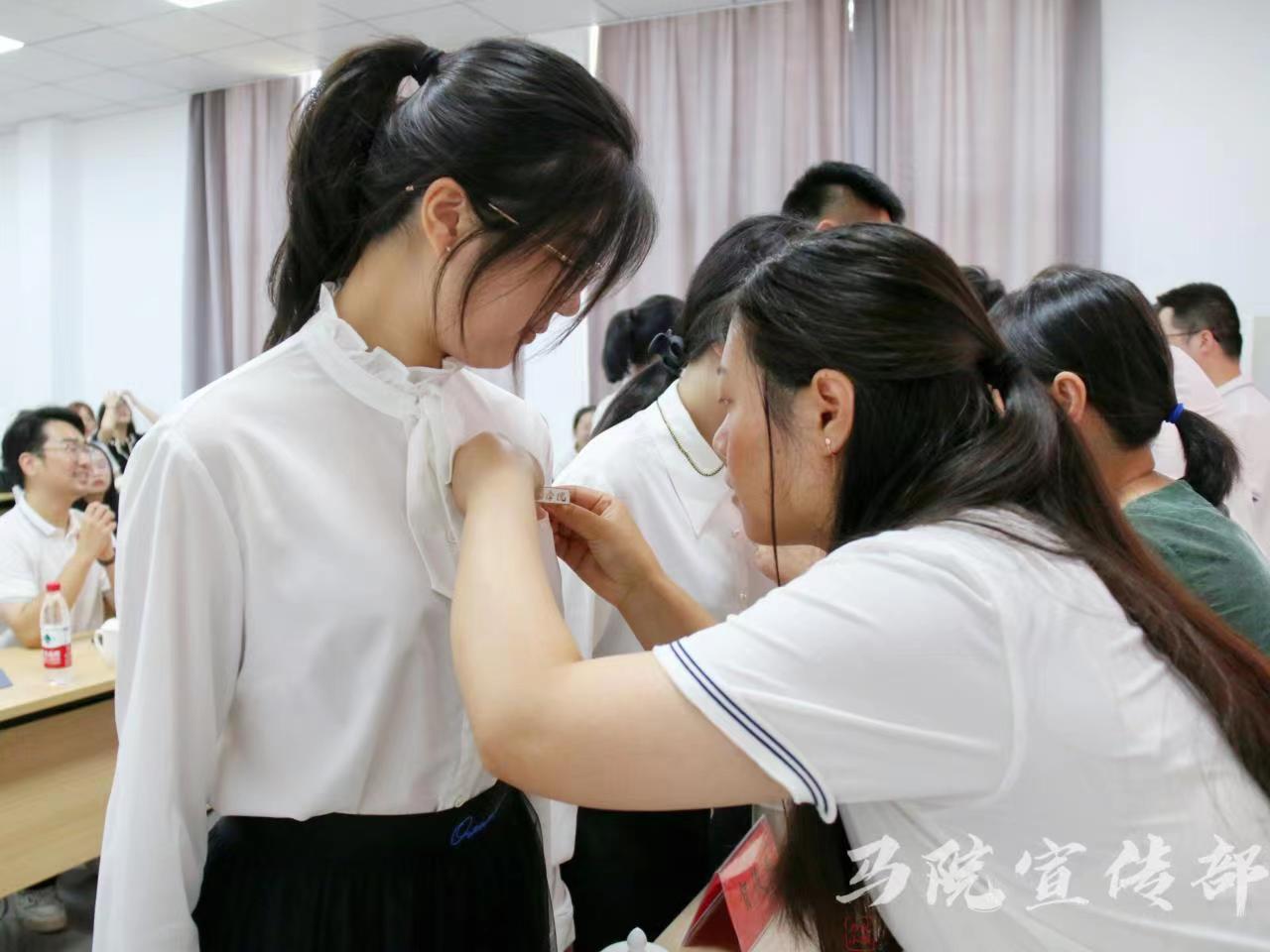 开学典礼在庄严的国歌声中拉开序幕。伴随着昂扬的进行曲,学院领导和新生班主任分别为新生代表佩戴校徽,其他新生在台下也为自己佩戴上了校徽。带上校徽,我们从此是“台院人”,让我们一同执笔,抒写青春的新篇章。