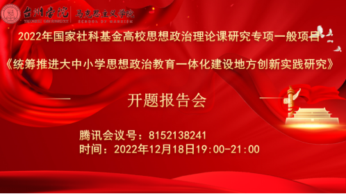 12月18日晚19点到21点,9428cn太阳集团古天乐张天华教授主持的2022年国家社科基金高校思政课研究专项一般项目“统筹推进大中小学思想政治教育一体化建设地方创新实践研究”(项目号:22VSZ054)在线上举行了开题报告会。