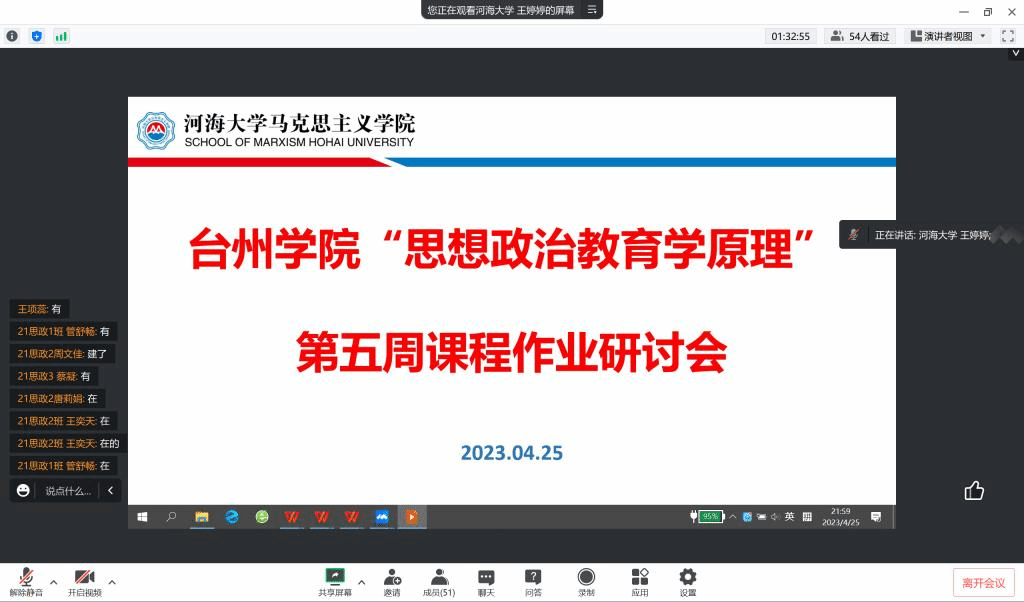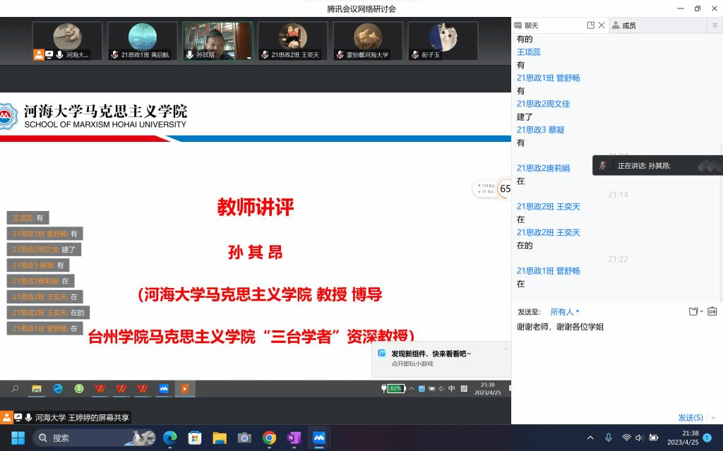 4月25日晚,9428cn太阳集团古天乐思想政治教育学原理课程组举办线上研讨会。课程主讲教师、公司“三台学者”资深教授、河海大学博士生导师孙其昂出席并指导。课程助教、河海大学思政专业博士生蒙怡馨、硕士生王婷婷、彭子玉列会并发言。思政专业47位员工参与了此次线上研讨会。