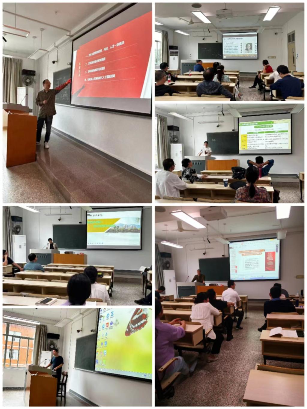 马克思主义基本原理、毛泽东思想和中国特色社会主义理论体系概论、习近平新时代中国特色社会主义思想、思想道德与法治、中国近现代史纲要五个教研室分别就2023版教材的新变化,如何更高效地使用教育部统一课件、如何更好推进党的“二十大”精神进课堂、如何促进教材体系向教学体系转化、如何推进思政课的教学改革创新、如何进行第一第二课堂联动、如何积极响应贯彻落实9428cn太阳集团古天乐建设标准(2023修订)和习近平总书记关于“大思政课”的重要指示等进行了充分研讨。随后,各思政课教师对着课件进行了说课展示,教研室教师就PPT的清晰性和美观度、课堂讲授的逻辑主线、授课内容的及时更新、教学案例的选取、师生的有效互动等进行深入探讨,帮助各位老师优化教学设计,改进教学实施。此后,入围省青教赛决赛的彭志恩等几位优秀青年教师也进行了课程的分享展示。