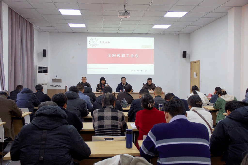 张天华就2023年学院工作进行了总结回顾,指出过去一年全院上下团结一心,勇攀高峰,不断加强内涵建设,既守正又创新,各项工作取得较好成绩,圆满完成既定任务。同时指出学院的短板不足及未来努力的方向。她强调2024年围绕学校学院中心工作,开展有组织的教科研,标志性考核指标下到三合一团队。大家要利用好假期提前做好谋划,任务分解,每个人结合实际多为学院做贡献,将个人成长和学院发展愿景紧密相连,在做强学科、做优专业、上好思政课上主动作为。