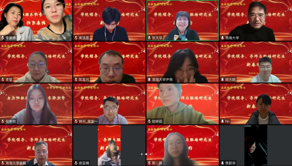 1月31日晚,马学院为联培研究生召开“新春有约”线上会议,特邀渤海大学马克思主义经理经理金毅、副经理尹燕、郭小虎及研究生家长代表参会,经理张天华、副经理李跃华、党总支副书记徐培林、研究生导师代表陈昌兴出席家校联手、师生同心“新春有约”主题会议,12名联培研究生参会,会议由硕士研究生导师张天华教授主持。