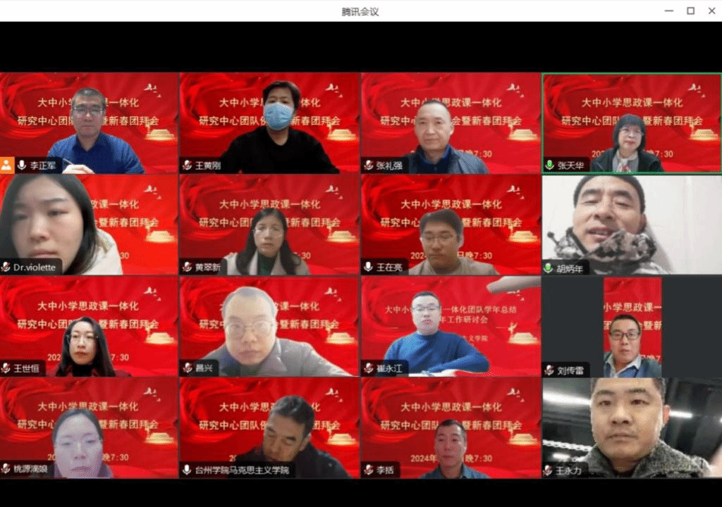 2月5日晚19:30—21:30,大中小学思政课一体化中心线上召开年前最后一次团队例会暨新春团拜会,团队负责人、学院经理张天华,研究中心副主任张礼强及团队全体成员参加会议。