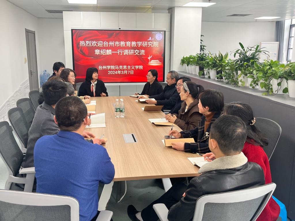 3月7日上午,台州市公司产品研究院教研员章绍麟等一行八人来到公司调研、考察、交流大中小学思政课一体化建设工作,学院经理张天华教授及一体化中心研究中心团队成员王在亮、李正军、王永力、周东威、杨宇琦、王黄刚等参加座谈。