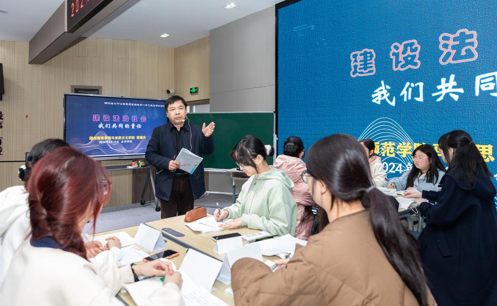 张建庆老师开出了“建设法治社会”的大学《思想道德与法治》思政课程。张老师通过设计“法治”是走向“自由人的联合体”的必由之路、维系社会健康有序运行的核心价值观、如何实现发展成果由人民共享三个学习任务,每个议题下设相应的议学活动,充分发挥员工的积极性,构建高效课堂。张老师注重师生互动,引导员工思考“法治社会”是什么、应该怎样建设法治社会、建设法治社会有什么意义。整堂课逻辑严谨、连贯有序,突出重点、突破难点,讲练结合、板书设计新颖独特,体现了“教师为主导”“以员工为主体”的教育理念,让政治课更有广度,有深度,有温度。