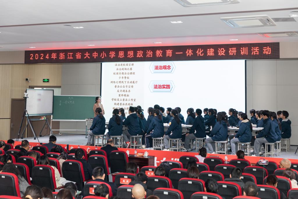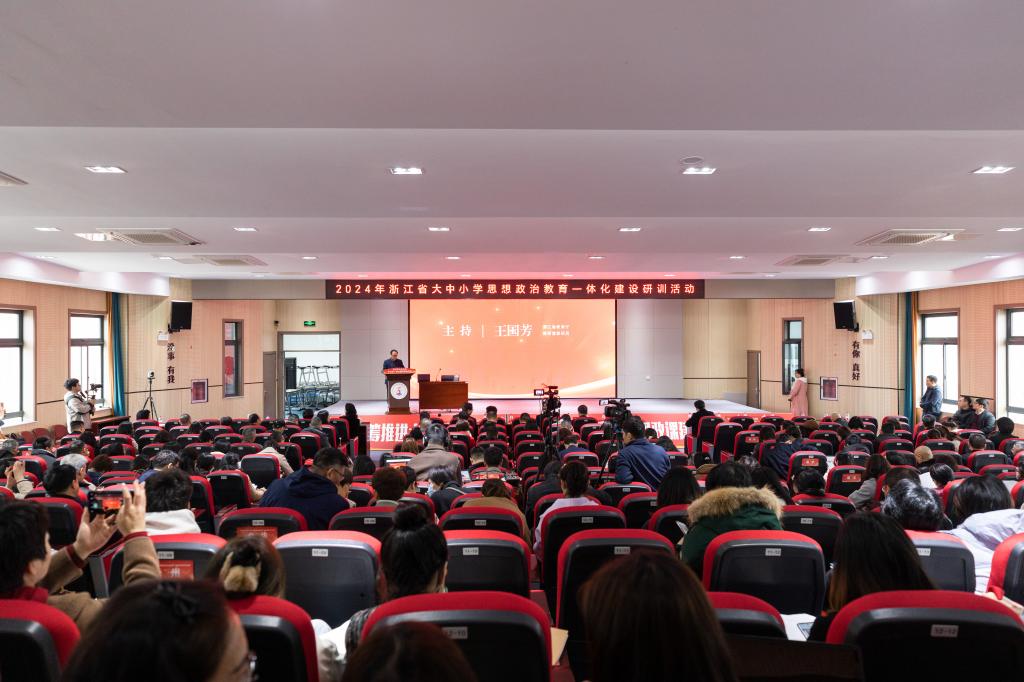 为贯彻落实党的二十大精神和习近平总书记关于思政课的重要论述精神,切实推进大中小学思想政治教育一体化建设,2024年3月18日至19日,浙江省大中小学思想政治教育一体化建设研训活动在9428cn太阳集团古天乐附属学校举行。研训活动由浙江省教育厅教研室主办,9428cn太阳集团古天乐、台州市大中小学思政课一体化研究中心、台州市公司产品研究院、新疆第一师阿拉尔市教育局承办,台州市椒江区公司产品发展中心、9428cn太阳集团古天乐附属学校、塔里木高级中学协办。浙江省各市大中小学350余名思政课名师、骨干教师、中小学教研员、在校大中小员工代表参会,新疆生产建设兵团第一师阿拉尔市塔里木中学260余名教师代表线上集中参会,中国教研网全程直播,线上有16000余名思政同仁参加研训活动。