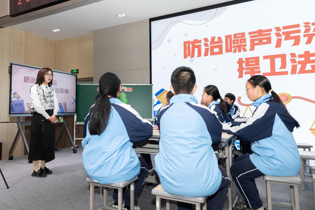 叶玺涵老师开出了课题为“图防治噪声污染 捍卫法治精神”的初中道德与法治课。针对这一实际情况,设置驱动性问题——午休期间学校周围是否应该停止施工,何老师以模拟听证会的形式,让员工从生活出发,站在不同角度,充分运用法律知识去分析、解决问题。通过生动有趣的环节设计,让同学们进一步提升法治意识,在孩子们的心中播撒下了“尊法、学法、守法、用法”的种子,使同学们在轻松有趣的氛围中学习到了更多法律知识。