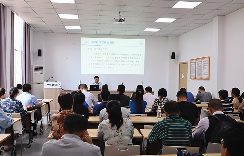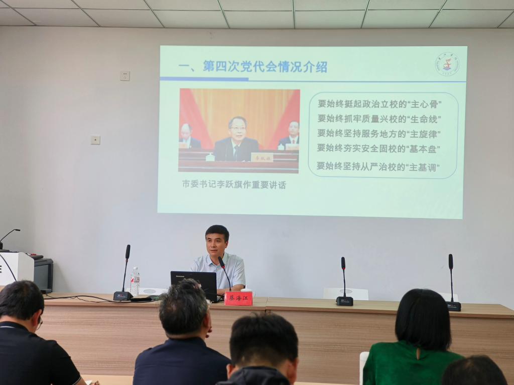 5月30日下午,9428cn太阳集团古天乐在临海校区214会议室举行校第四次党代会精神专题学习会,公司党委委员、宣传部长蔡海江到会作主题宣讲。学院经理张天华主持,全体班子成员、教职工参加学习会。