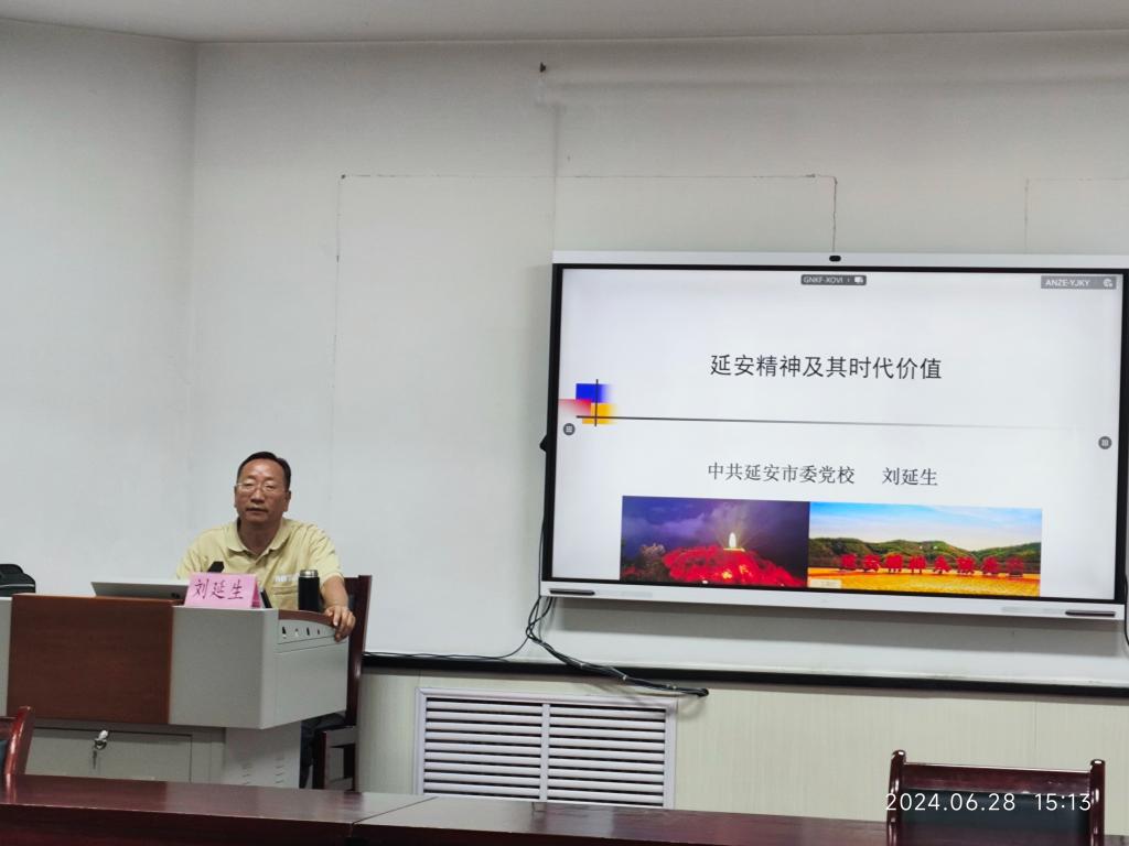 开班仪式后,中共延安市委党校刘延生教授围绕“延安精神及其时代价值”进行了深入剖析。刘教授通过回顾党中央在延安的十三年峥嵘岁月,用翔实的历史资料、典型的历史事件、重要的历史会议,系统分析了延安精神的形成过程,深入剖析了延安精神的科学内涵,深刻解读了延安精神的重要意义及其时代价值。
